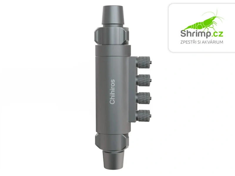 Chihiros Dosing Flow Adapter je praktický adaptér s hliníkovou konstrukcí, který ti umožní připojit až 4 dávkovače hnojiv přímo na výstup z externího filtru – a tím zajistí rovnoměrné rozptýlení živin po celém akváriu.