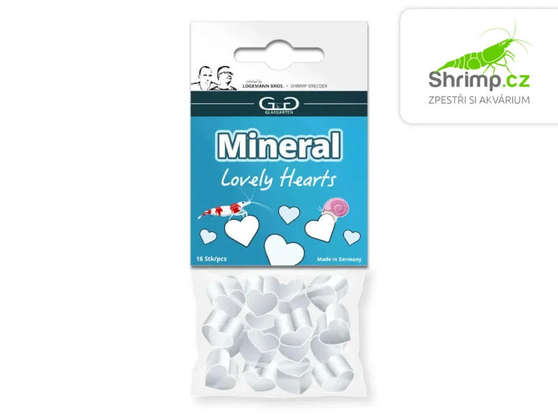 GlasGarten Mineral Hearts je doplňkové krmivo ve formě srdíček, které zajišťuje dlouhodobý přísun minerálů pro vodní i suchozemské bezobratlé – krevetky, plže, raky i kraby. Stačí vložit kousek minerálního krmiva do akvária nebo terária, živočichové ho budou postupně konzumovat a získají tak potřebné živiny.