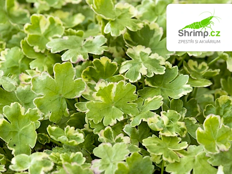 Hydrocotyle sibthorpioides 'Variegata'je nízká, plazivá rostlina s kulatými listy, které jsou atraktivně panašované – zelené se smetanově bílými okraji. Díky jemnému a hustému růstu vytváří souvislý koberec, ideální pro pokrytí půdy ve vlhkých záhonech, na březích jezírek nebo mezi kameny.