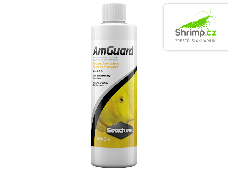 Seachem AmGuard™ je komplexní a bezpečný odstraňovač amoniaku (čpavku) a dusíkatých sloučenin (dusitan a dusičnan) pro sladkovodní a mořská akvária. Amoniak může existovat ve dvou formách: volný a ionizovaný. Toxická je jen volná forma. Seachem AmGuard neutralizuje toxický amoniak a dusitan, čímž chrání ryby před otravou. AmGuard™ je kompatibilní s biologickými filtry a neovlivňuje pH vody. Je to ideální produkt pro nově založená akvária nebo akvária s nečekanými poruchami filtrace.