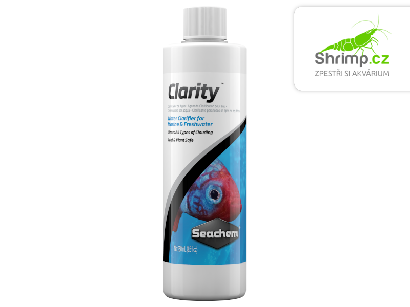 Seachem Clarity™ je komplexní čistič vody, který je bezpečný pro sladkovodní i mořská akvária. Obsahuje srážecí a flokulační činidla v jedné lahvičce pro maximální účinnost. Odstraňuje bakteriální zákal, zelený zákal a mikroskopické částice. Seachem Clarity™ funguje tak, že shlukuje mikroskopické částice do větších kusy, které dokáže filtr zachytit. Následně bude voda ve tvém akváriu čistá a jasná .